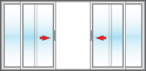 With four-panel sliding patio doors, one or two of the doors are mobile and simply slide horizontally over an adjacent stationary door. The operable panel can be the far right, far left or two center panels. In most cases, the panels will be of equal size, but we can create custom four-panel sliding patio doors for your specific home or business. Move your cursor over the illustration to see how sliding patio doors operate.